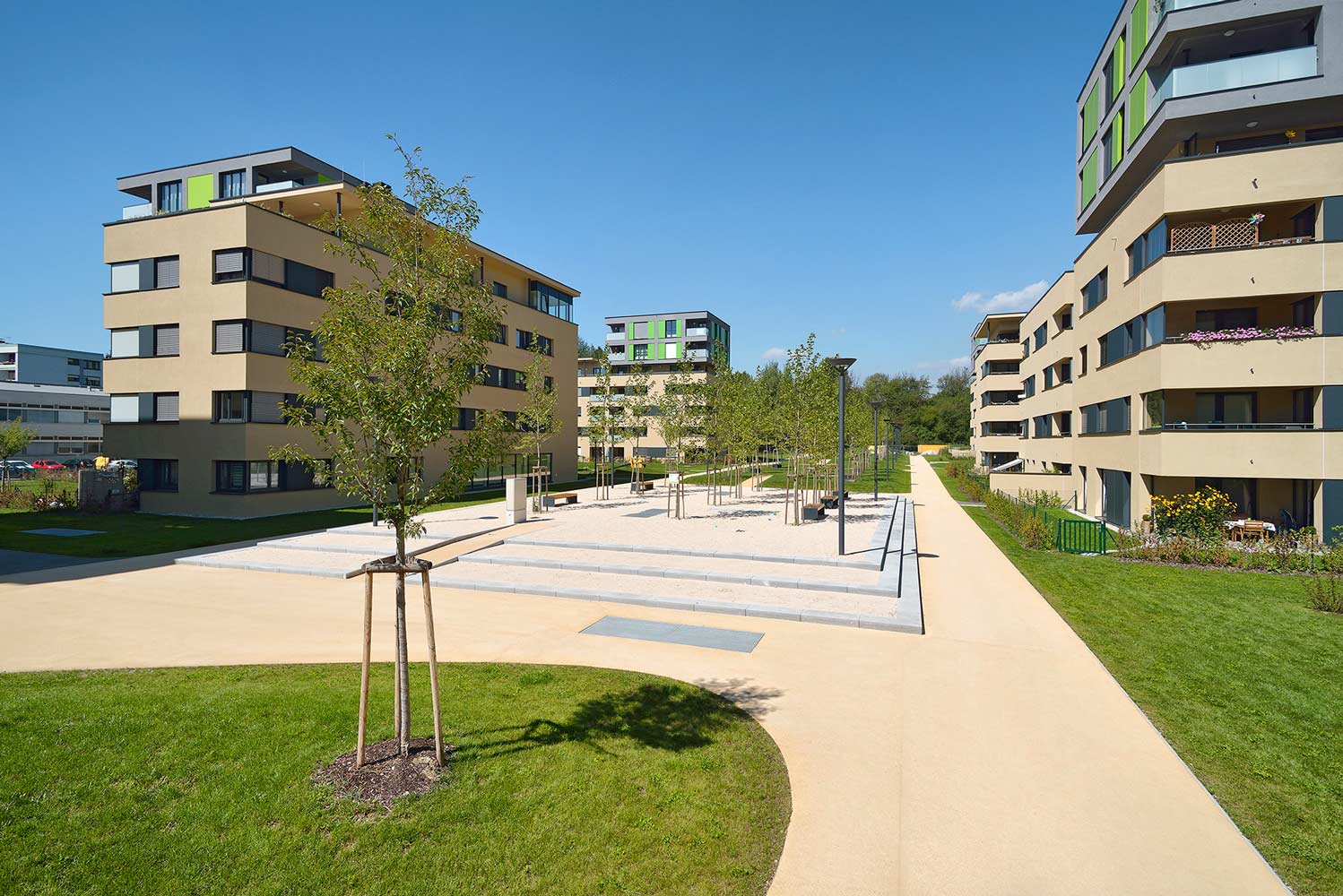 Der Wohnpark in Linz wird von einem breiten Grünstreifen durchzogen, unter dem sich die Tiefgaragen der Häuser befinden. Die auf dem Grünstreifen entstandene „Lange Allee“ wird von Joggern, Spaziergängern und Radlern gleichermaßen ausgiebig frequentiert. Alle profitieren von dem fugenlosen, rutschfesten Untergrund von bam COLOUR, der mit seinem hellen, beigen Farbton auch noch für eine freundliche Atmosphäre sorgt.