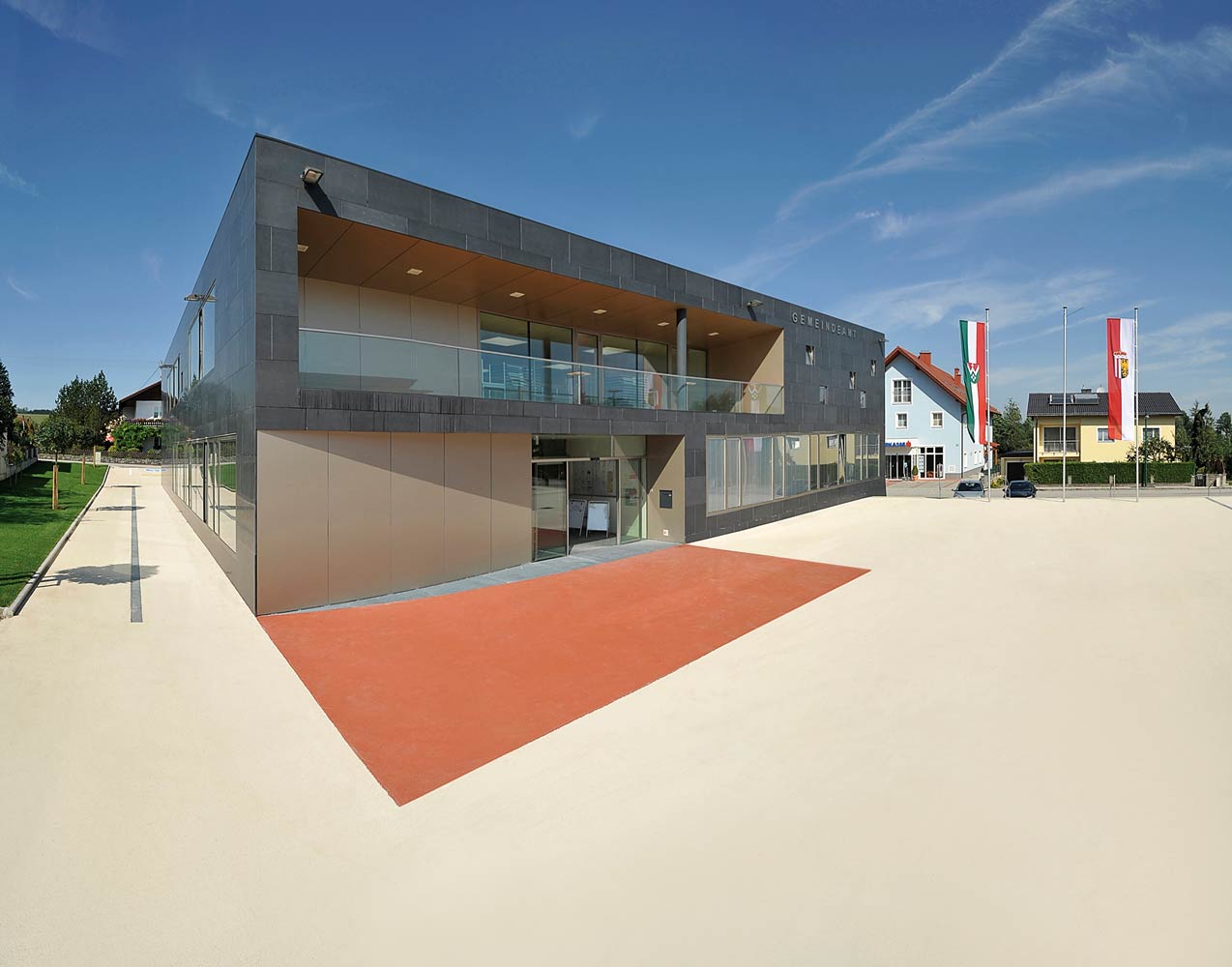 Die Gemeinde Weißkirchen an der Traun schenkte ihren Bürgern im Zuge des Rathausneubaus einen großzügig gestalteten Dorfplatz, auf dem sich die puristische Architektur des Gebäudes widerspiegelt: Der dafür eingesetzte, sandbeige bam COLOUR wurde dem Farbton der umliegenden Betonstufen angeglichen. Und direkt vor dem Gemeindeamt liegt den Besuchern ein roter bam COLOUR-Teppich zu Füßen.