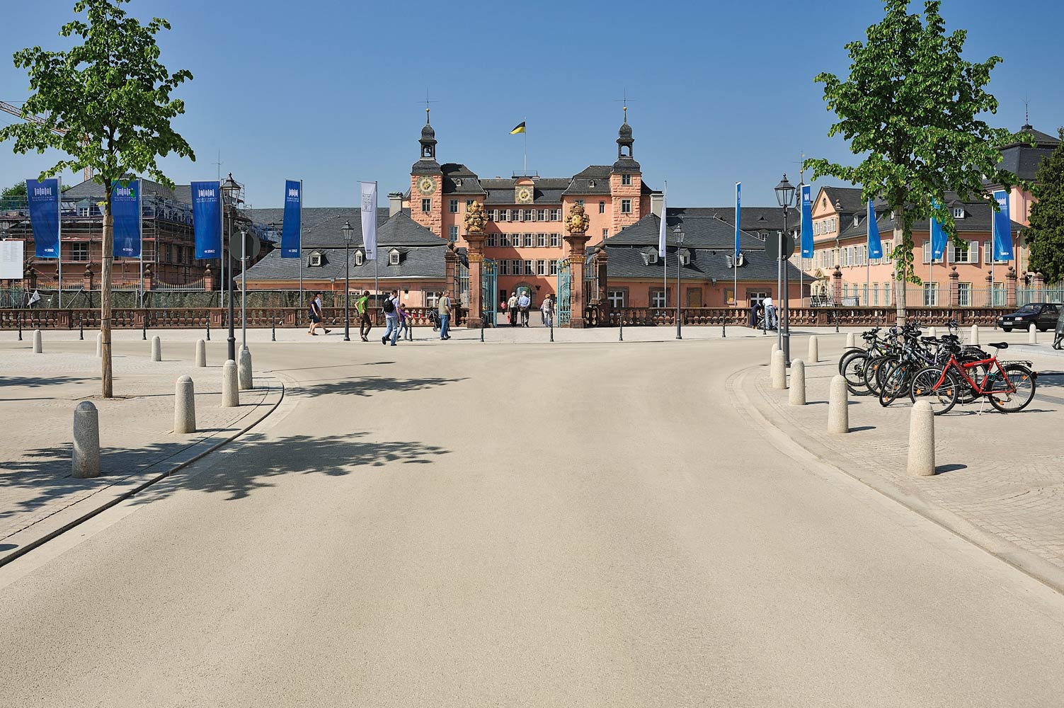 Im Jahr 2011 hat der Schwetzinger Schlossplatz seine ursprüngliche majestätische Anmutung zurückerhalten. Dank der Umgestaltung des gesamten Areals in eine verkehrsberuhigte Zone konnte die optische Verbindung zwischen dem kurfürstlichen Schloss, dem Schlossgarten und der bürgerlichen Bebauung am Stadtrand wiederhergestellt werden. So entspricht der Platz heute der historischen Anlage aus dem Barock. Ein ganz wichtiger Beitrag zum hellen und einladenden Gesamteindruck liefert die farbige Deckschicht aus bam COLOUR nach dem Splittmastixprinzip, der auf einer Fläche von 1.700 Quadratmetern eingebaut wurde. So hat man die perfekte Grundlage geschaffen, um den reibungslosen Ablauf des öffentlichen Busverkehrs zu gewährleisten.