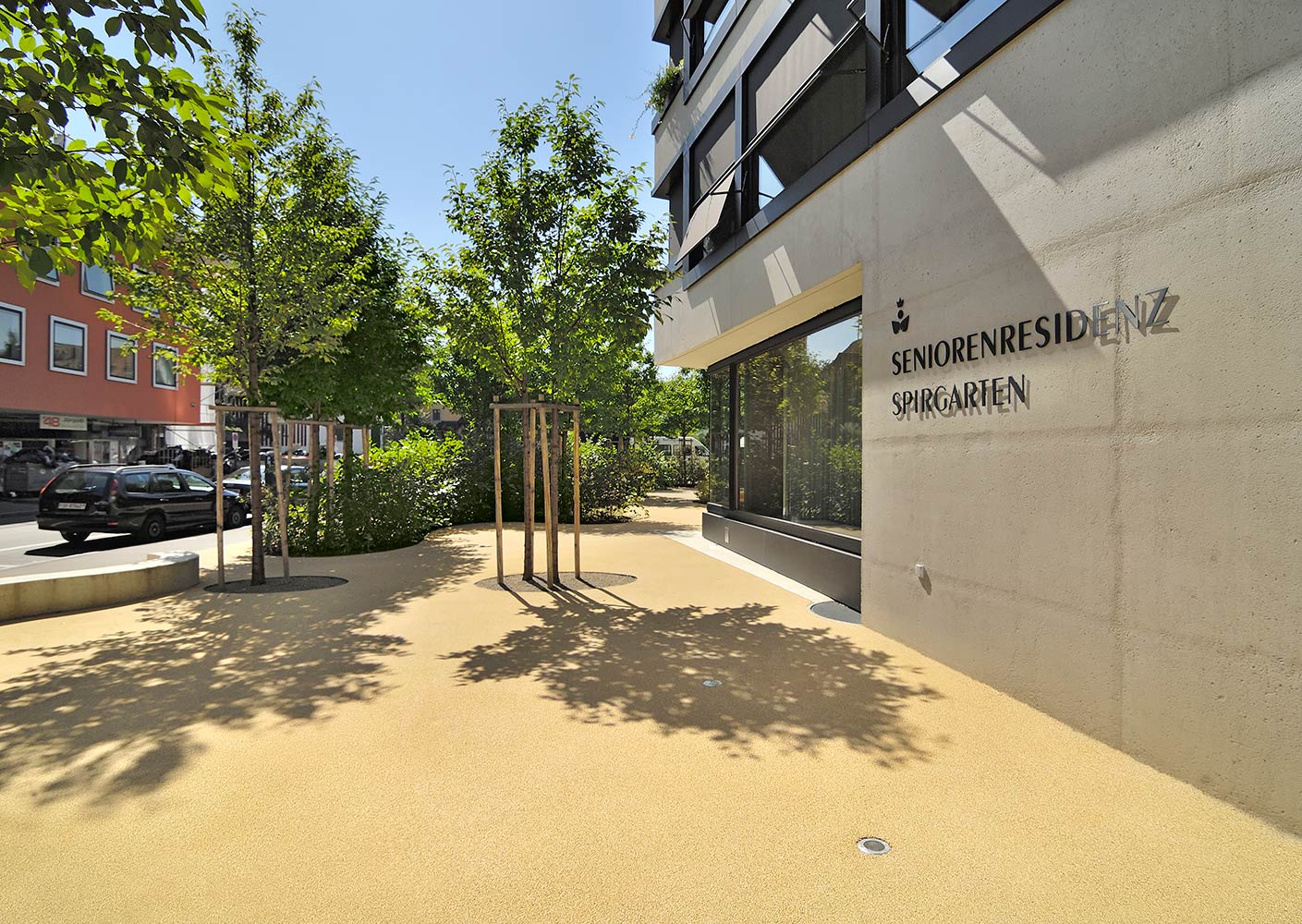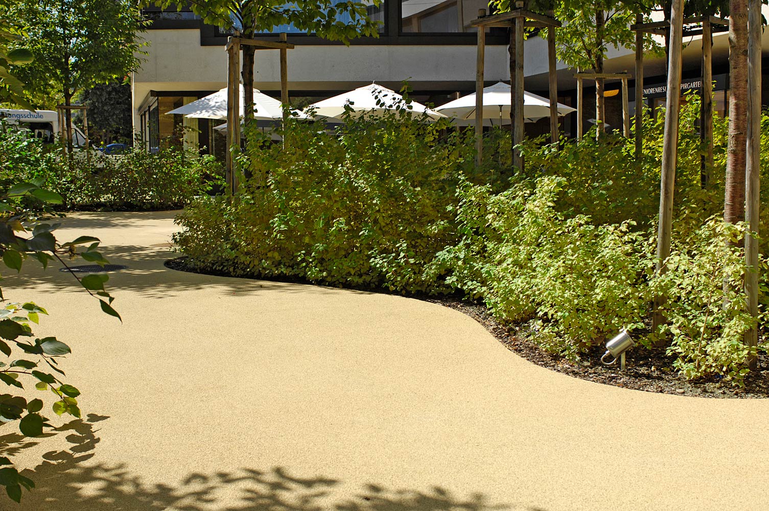 Gerade bei älteren Menschen spielt die problemlose Begehbarkeit von Flächen eine zentrale Rolle. Der für die Seniorenresidenz Spirgarten entwickelte, wasserdurchlässige bam COLOUR Belag überzeugt nicht nur mit seiner ansprechenden Farbgestaltung, sondern garantiert zu jeder Jahreszeit sichere Nutzbarkeit. Die plane und rutschfeste Oberfläche lässt sich im Winter einfach und schnell von Schnee oder Eis befreien.