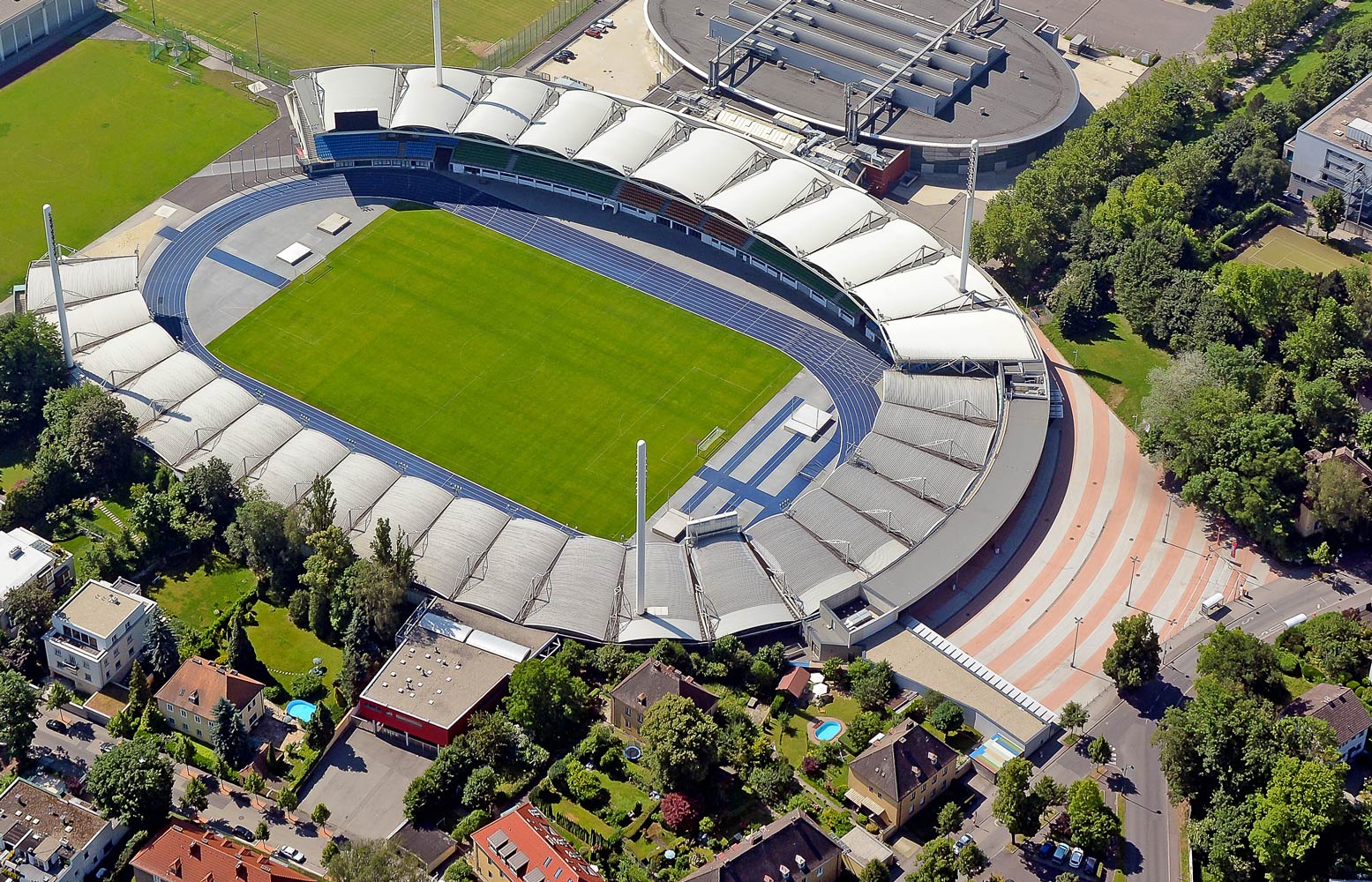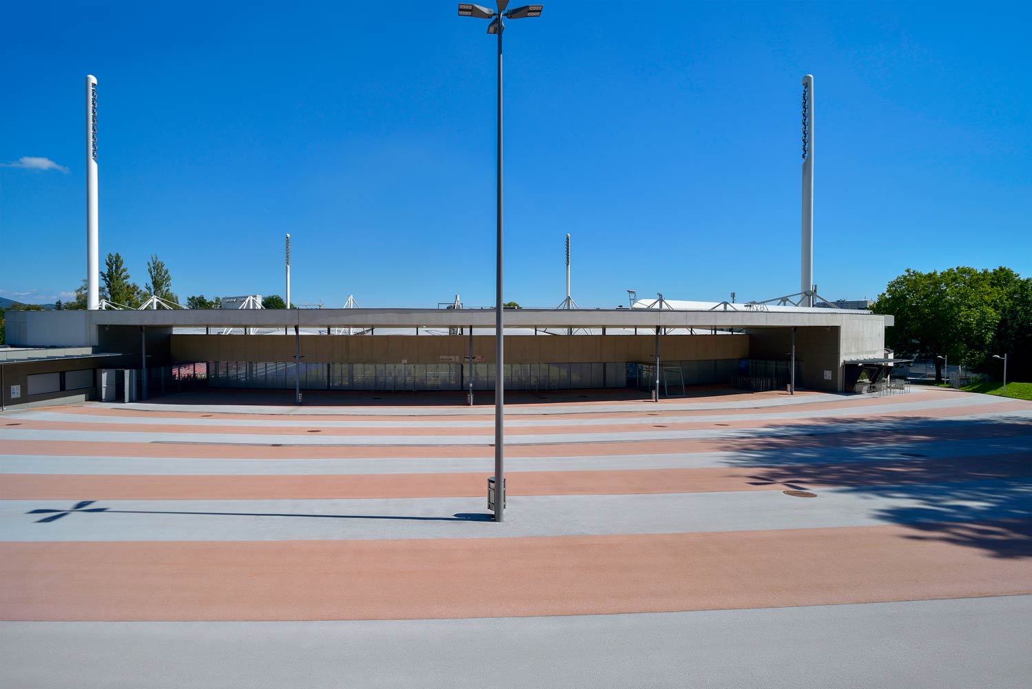 Für die Fans aus Linz ist der Stadionbesuch nun noch ein bisschen schöner geworden. Denn auf dem Weg zum Spiel überqueren die Anhänger beider Linzer Fußballvereine erst einmal einen überdimensionalen „Zebrastreifen“, der in den Stadtfarben hellrot und cremeweiß leuchtet. Die Linienführung der 3,80 Meter breiten, mit bam COLOUR gestalteten Bahnen gliedert eine Gesamtfläche von 4.700 Quadratmetern und nimmt den Radius des ebenfalls neu gebauten Stadiondachs auf. Dabei wurden auch die wasserführenden Rinnen wirkungsvoll kaschiert.